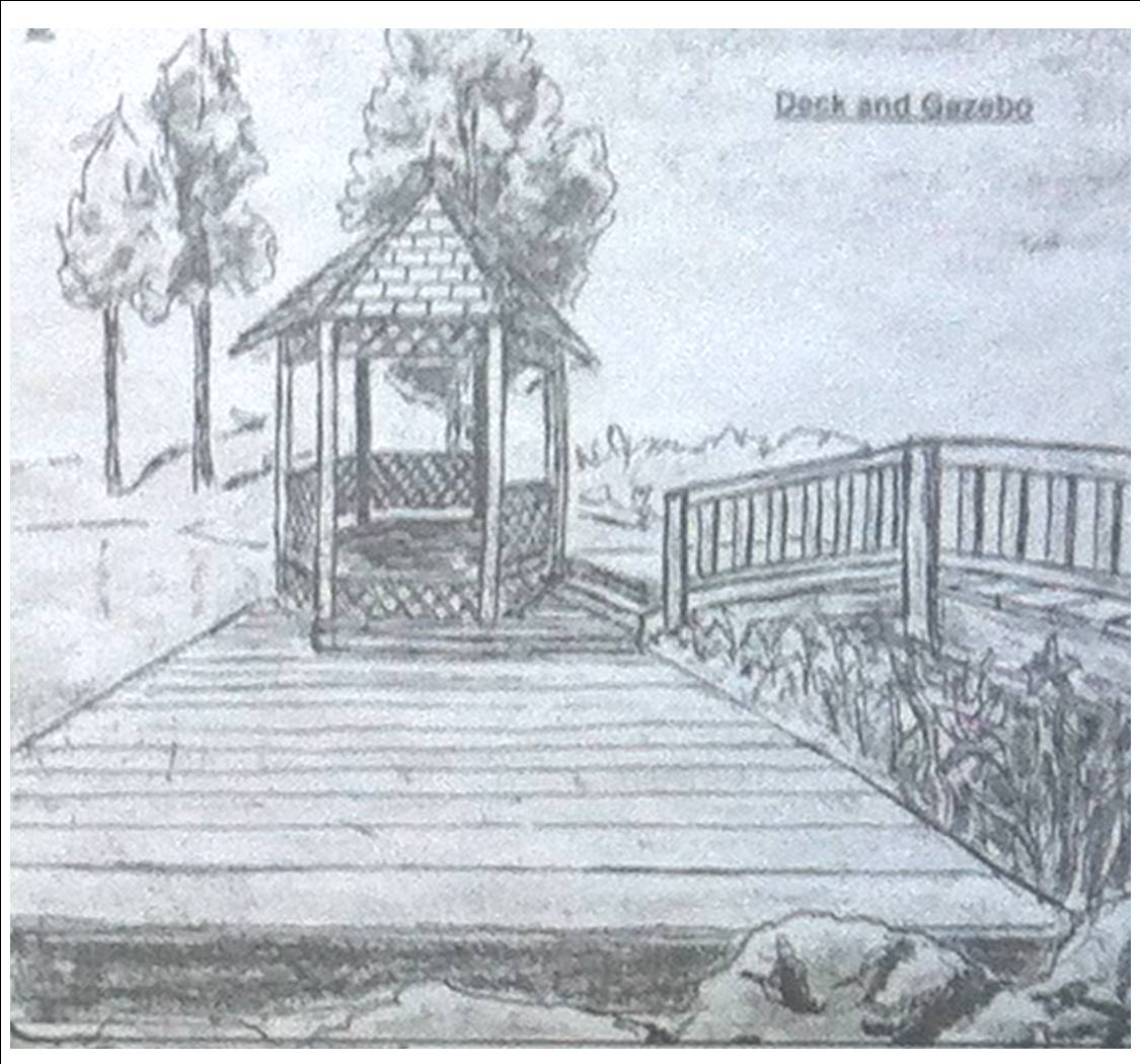 is to provide a destination from which the pond can be more fully enjoyed. The deck would serve as a pier for fishing or tying up small water craft like canoes or kayaks. The gazebo provides a covered area from the sun where an observer can contemplate the vista or enjoy a casual lunch.