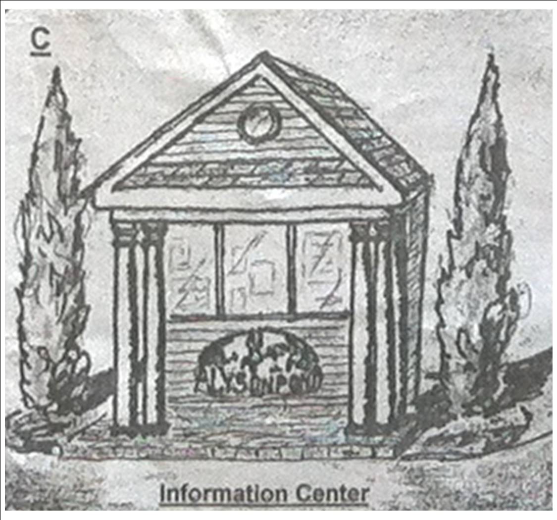 The appearance of the Center would be modeled after the Clubhouse entrance, with columns supporting a porch that protects the bulletin board / cases from the weather.